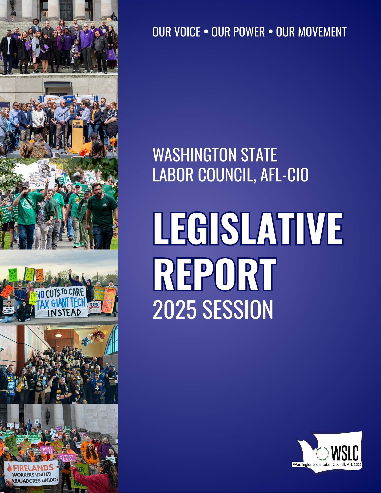 The 2025 edition of the Washington State Labor Council’s Legislative Report is now available. (Download the full PDF.) This annual report summarizes the fate of legislation affecting working families in each year’s session of the Washington State Legislature, and how each legislator voted on these issues. (You can also download the WSLC 2025 Voting Record only.) As always, many union members came to Olympia during the 2025 session to share their personal stories at hearings, or meet with their legislators, or demonstrate outside the State Capitol. As documented in this report, their voices were heard on a number of important issues. Rank-and-file labor activism continues to be the key to successfully advancing pro-worker policies.
