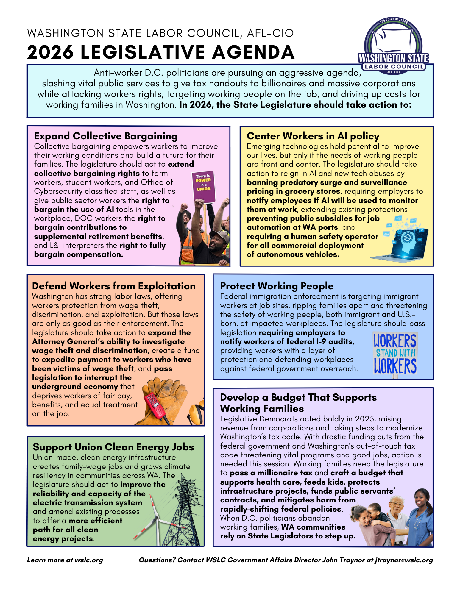 The Washington State Labor Council, AFL-CIO’s 2026 Legislative Agenda is centered on empowering working people and protecting working families.